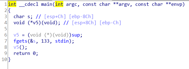 v5에 sup함수의 주소를 넣고 s변수에 133바이트 만큼 입력을 받는다. 그리고 v5를 실행한다.